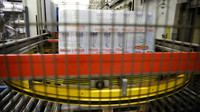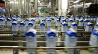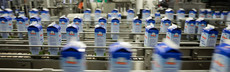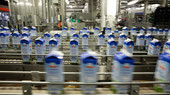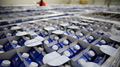 Dann geht es für die Milchpackungen weiter über das Fließband. Ein Sticker wird einige Kurven später angebracht.