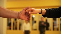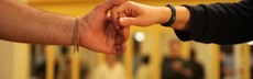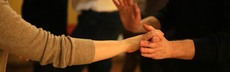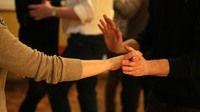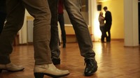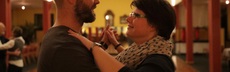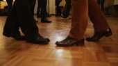 Der Grundschritt ist leicht, aber eine Wiederholung wert: Beim wilden Tanzen auf Feiern war meine Ausführung bereits zur Schludrigkeit verkommen, stelle ich fest. Schnell geht es weiter: Wir lernen, uns voneinander zu lösen und wieder aufeinander zu zu tanzen, natürlich alles im Eins-zwei-tipp-Modus. Der Mann drückt die Frau mit der Hand von sich weg, als Zeichen dafür, dass es in die getrennte Figur geht. „Ein bisschen wie ein Puffer bei der Eisenbahn“, erklärt Ralf.