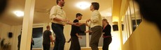 Auch bei uns wird’s ästhetischer. Die Frauendrehung ist dran, wir gehen aneinander vorbei, heben die Arme, Michael dreht mich ein, ich drehe mit, zu ihm hinüber blickend. Meinem Tanzpartner kribbelt’s schon in den Füßen: Er will sich auch endlich drehen! Kurzerhand greift er Tanzlehrer Ralf Buchholtz vor und baut die Männerdrehung mit ein. Überhaupt probiert Michael zwischendurch ein paar Figuren aus, die mir aus meiner Tanzstundenzeit bekannt vorkommen.