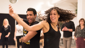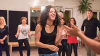 Die erste Hälfte der Stunde tanzen wir Salsa L. A. Style, auch „Salsa auf Linie“ genannt. Dabei bewegen wir uns, wie der Name schon sagt, auf einer Linie. Die Frau ist weniger auf den Mann fokussiert als bei anderen Salsa-Stilen. Auch können die Tänzer immer mal wieder für sich glänzen, weil es längere Phasen ohne Körperkontakt gibt. Das Für-sich-glänzen – in der Fachsprache „Shines“ genannt – macht den Tanz für Filme, Shows und Tanzturniere besonders interessant.