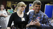 Und noch ein Tanz! Zwischendurch schaue ich lieber zu, werde aber immer wieder zum Mitmachen ermutigt. Diesmal tanze ich mit Karin Heidrich und lerne den Swinging-Schritt, den einzigen Schritt, den man im Square Dance in klassischer Paartanzhaltung tanzt, wie ich erfahre. Zusammen drehen wir uns hüpfenderweise, um dann schnell in die nächste Figur zu wechseln. Es ist gerade mal der zweite Tanz, aber ich muss mich sehr konzentrieren, um nicht zu oft in die falsche Richtung abzuhauen oder dem falschen Partner in die Augen zu schauen. Aber Karin passt gut auf mich auf.